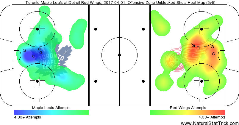 The Leafs were outshot 42-27 overall and gave up 31 home-plate chances by Natural Stat Trick’s count.