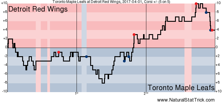 6. The CBC broadcast mentioned that Zetterberg and Matthews have matched up throughout the season series, resulting in five of the Red Wings’ six goals over the previous three games. It was a shot-for-shot, high-event matchup tonight — Matthews finished the game with a 13-12 edge in shot attempts in 12 minutes head-to-head against Zetterberg, the shots were 10-10 in that time, and the goal count was 2-2.