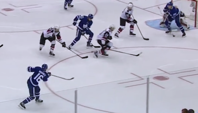 You had to tip your cap to some pretty impressive puck movement by the Coyotes on the first goal, but Nikita Zaitsev sent a blind backhand pass up the middle of the ice to start the Arizona possession, Dominic Moore blew a clearance, Ron Hainsey didn’t take advantage of a brief opportunity to clear, and the cross-crease pass to Brendan Perlini for the goal can’t get through all of Zaitsev, Hainsey and Moore.
