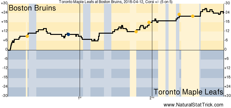 8. If the Leafs are planning to out-depth the Bruins in this series, they’re going to need a lot more than a 11% CF night from Tomas Plekanec. In his 7 minutes and change of 5v5 ice time, the Leafs were outshot 10-0, he lost his man for the back-breaking Pastrnak goal, and he won just four of 10 draws. The one silver lining if Kadri is out is that Johnsson opposite Kapanen did seem to bring the most out of Plekanec in his Leaf tenure so far (not saying a lot) and the L4 as a whole.
