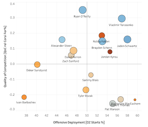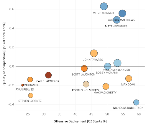In St. Louis, Berube was able to free up several scorers with specific offensive-zone deployment (those names in the top right quadrant). Of note, the Leafs were 30th in the league in offensive-zone faceoffs last season. They didn’t possess a third line to soak up some of those difficult starts to free up their top scorers.