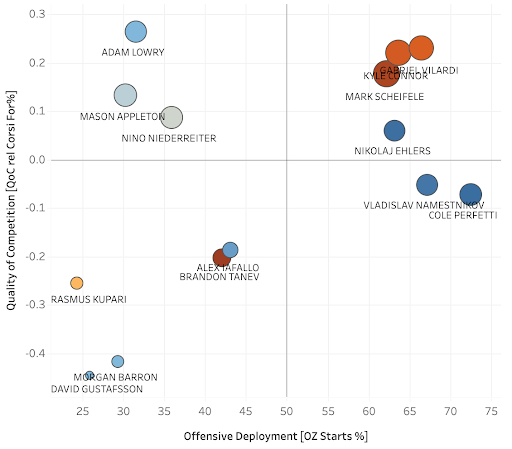 GM Brad Treliving has hinted at shifting the deployments this season, specifically around deploying Nic Roy as a checking center, similar to Winnipeg’s usage of Adam Lowry. The Jets’ deployment chart looked like this at forward last season: