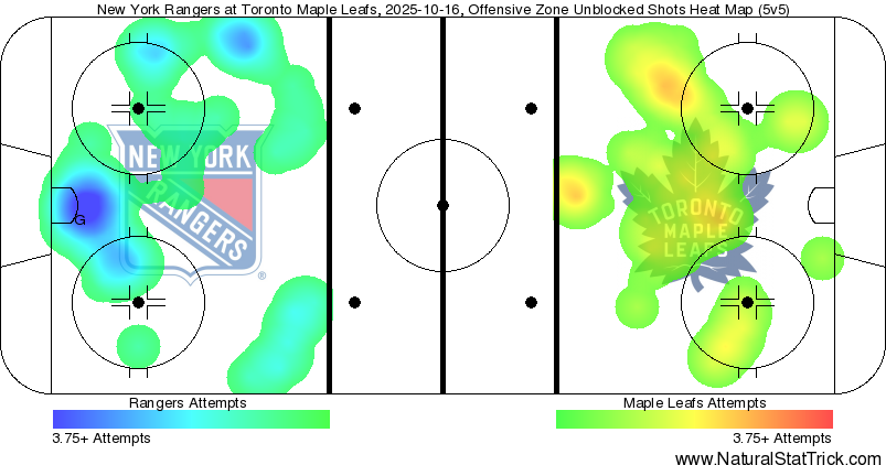 The Maple Leafs and Rangers recorded just four shot attempts each at five-on-five in the first period of this game, with special teams time taking up nearly half the period.