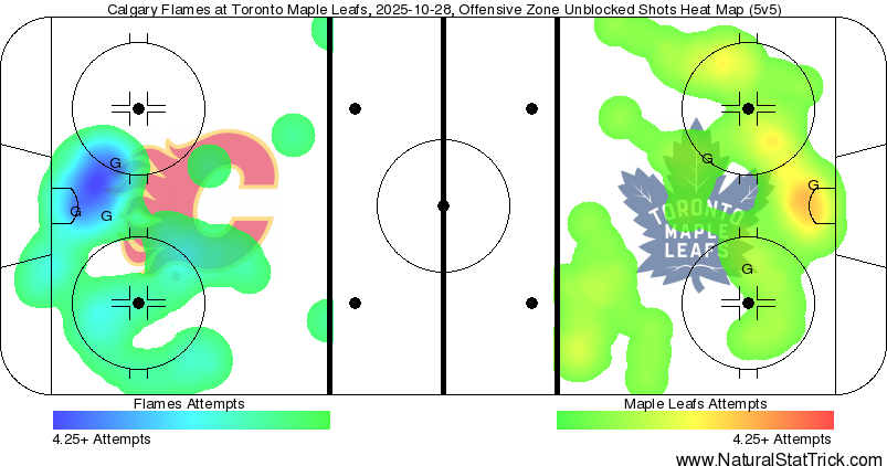 Despite the slow start — and with the assistance of a good kill around the midway point — the Leafs should’ve benefited from the Flames’ parade to the penalty box (three penalties) in the second half of the opening frame by tying the game, at a minimum. They fired 13 shot attempts but couldn’t get anything to go; the zone time, puck movement, and battle to win pucks back after the shot attempts were reasonably solid, but they couldn’t find their breakthrough. The wrinkle of Nylander at the goal line, as well as the sight of Matthews firing a few shots skating downhill, showed some promise in this game. Nylander, as a righty down low, can pass out to three left-handed shot options in Tavares, Matthews, or Knies. It’s an interesting concept, and a similar dynamic to a few years back with Mitch Marner stationed down low.