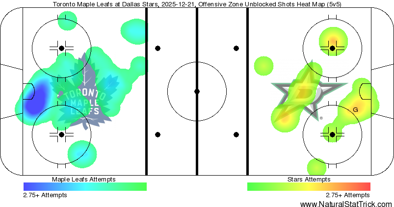 Nights when a team loses the goaltending and puck-luck battles despite out-playing the opponent are a part of life in the NHL for every team, and so are schedule losses. This was a 3-in-4 for both teams, but the Leafs were in a back-to-back with their third-string goalie in the net, and Dallas was rested at home with their starter in goal. The Leafs led high-danger chances 3:1 and still trailed by multiple goals, pre-Dallas-empty-netter. They also led in hits 24-11 despite owning more of the puck. This was a solid road effort against a top team in a tired situation.