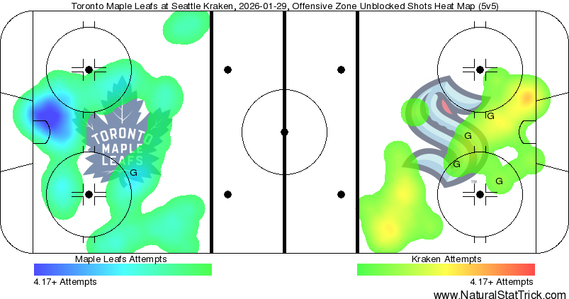 Nobody will want to hear it after this loss — and it’s completely fair — but over all situations, the Leafs out-attempted the Kraken 66-38. They outplayed them in this game and generally carried the play, but their defensive miscues are killers, and Stolarz isn’t bailing them out of anything at this point. All in all, this looked like a hockey game between two bad teams, with one playing slightly better in the run of play and the other capitalizing on bad mistakes by the opposition.