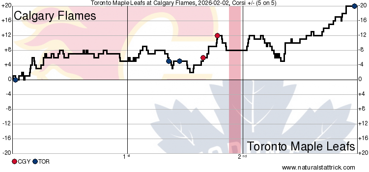 – This game was a simple one to break down: Was William Nylander on the ice or not? His line was up 17-9 in shot attempts, while every other Leafs line was tilted the other direction. You can live with the numbers of the Scott Laughton line, as it was basically a draw (5-6), with zero offensive-zone faceoffs. The numbers from Auston Matthews‘ line were glaring: out-attempted a ridiculous 21-8 against this Calgary team. They created next to nothing, and the only positive thing to be said is that they didn’t get scored on. The bar has to be a lot higher for the top line.